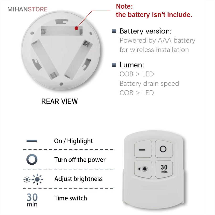 چراغها با استفاده از کنترل از راه دور با برد ۵ تا ۱۰ متر یا به صورت دستی از طریق فشردن قسمت مرکزی هر چراغ روشن و خاموش میشوند. در نتیجه حتی اگر چراغ در مکان مرتفع یا دور از دسترس نصب شده باشد بهراحتی میتوان از راه دور آن را کنترل کرد. طراحی بدون سیم باعث شده است که این چراغها برای نصب در هر مکانی مناسب باشند. نیازی به هیچگونه سیمکشی یا اتصال برق نیست؛ تنها کافیست ۳ عدد باتری AAA (برای هر چراغ) تهیه کنید و آن را در جای دلخواه بچسبانید.